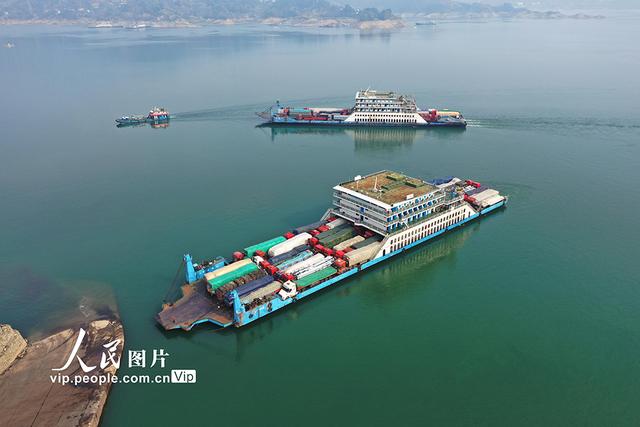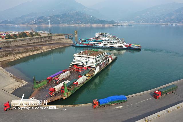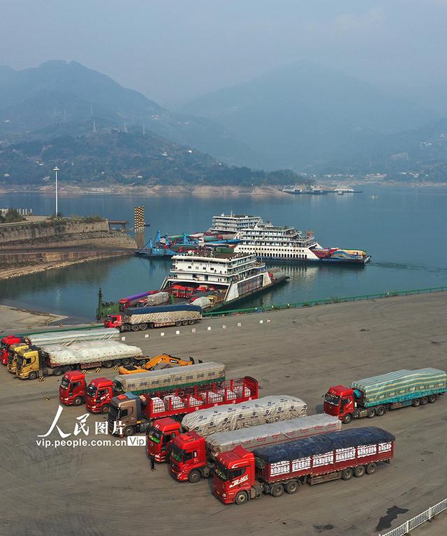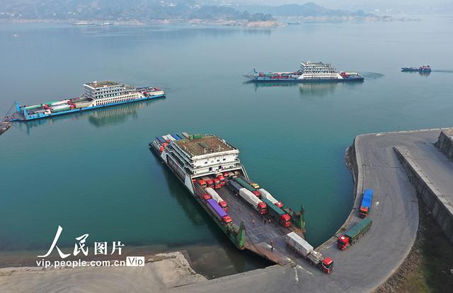 三峡库区滚装船运输是三峡翻坝运输的重要补充部分,进入四川、重庆的车辆在忠县和奉节码头搭乘滚装船在三峡大坝上游银杏沱滚装码头上岸,进入高速通往全国各地。而全国各地的重载货车在银杏沱滚装码头登船分别在忠县、奉节上岸进入重庆、四川等地。黄善军摄(人民图片网)