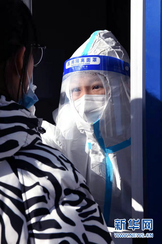 可爱“大白”在五常市铁路公寓小区为居民进行核酸检测。新华网发(张民生 摄)